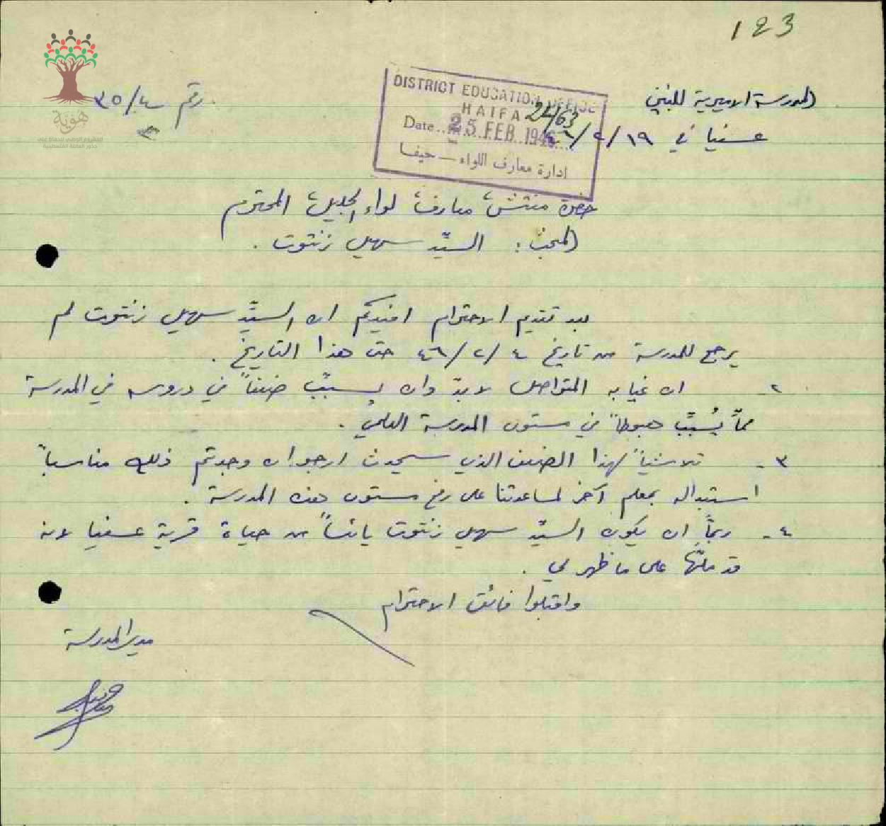 تكرار غياب المعلم سهيل زنتوت عن المدرسة وطلب استبداله بمعلم آخر تلاشياً لحالة الضعف بين الطلاب نتيجة تكرار غياب المعلم المذكور