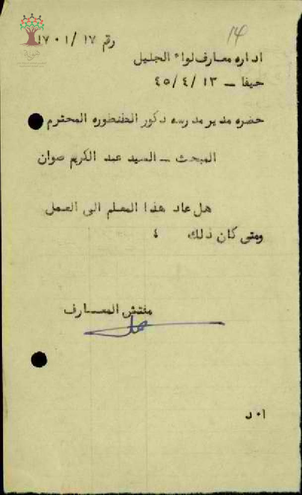 رسالة من مفتش المعارف الى مدير مدرسة الطنطورة يسأله عن عودة المعلم عبد الكريم صوان الى العمل