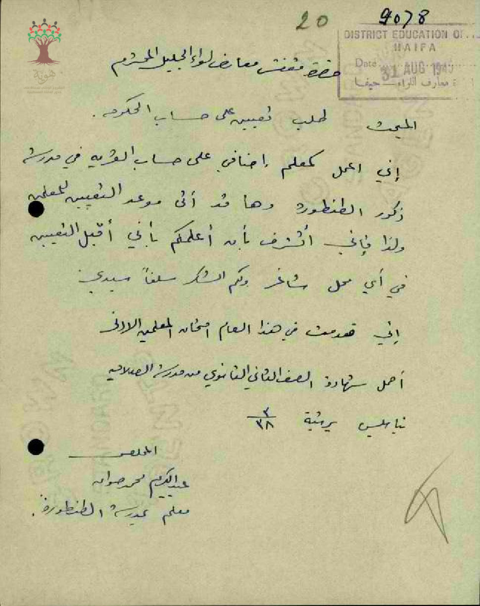 رسالة من المعلم عبد الكريم صوان الى مفتش المعارف يطلب تحويل راتبه على حساب دائرة المعارف