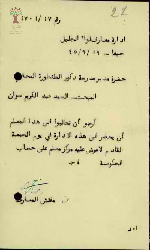 رسالة من مفتش المعارف الى مدير مدرسة الطنطورة يطلب حضور المعلم عبد الكريم صوان الى دائرة المعارف ليعرض عليه مركز معلم على حساب الحكومة