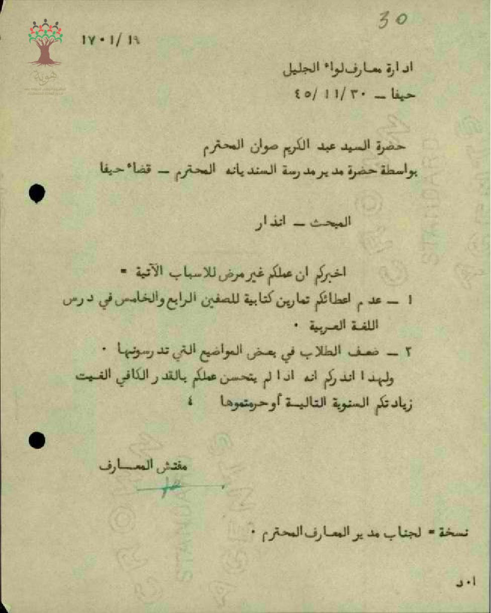 انذار موجه من مفتش المعارف الى المعلم عبد الكريم صوان