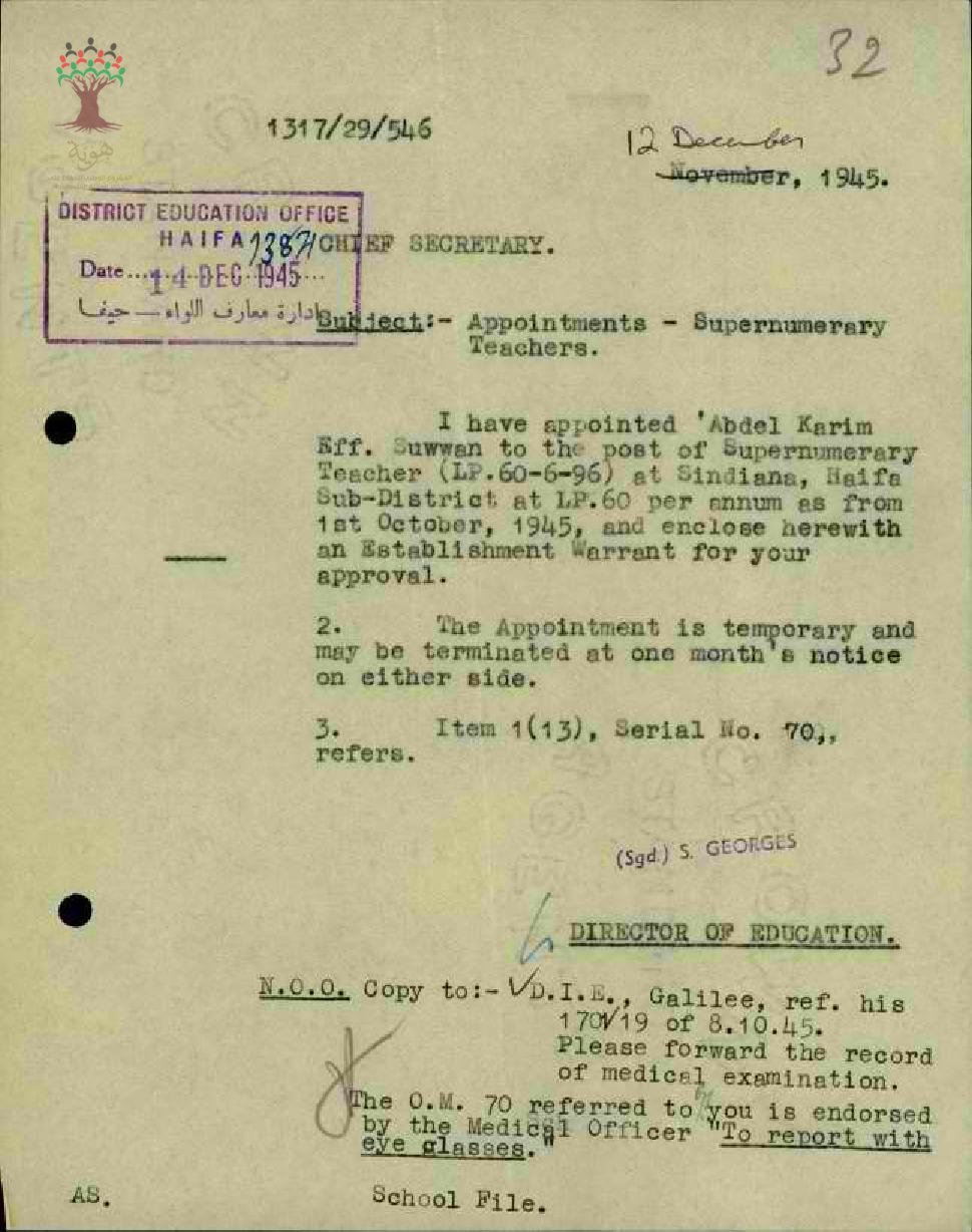 رسالة من مدير المعارف الى رئيس السكرتارية بخصوص تعيين المعلم عبد الكريم صوان في مدرسة السنديانة