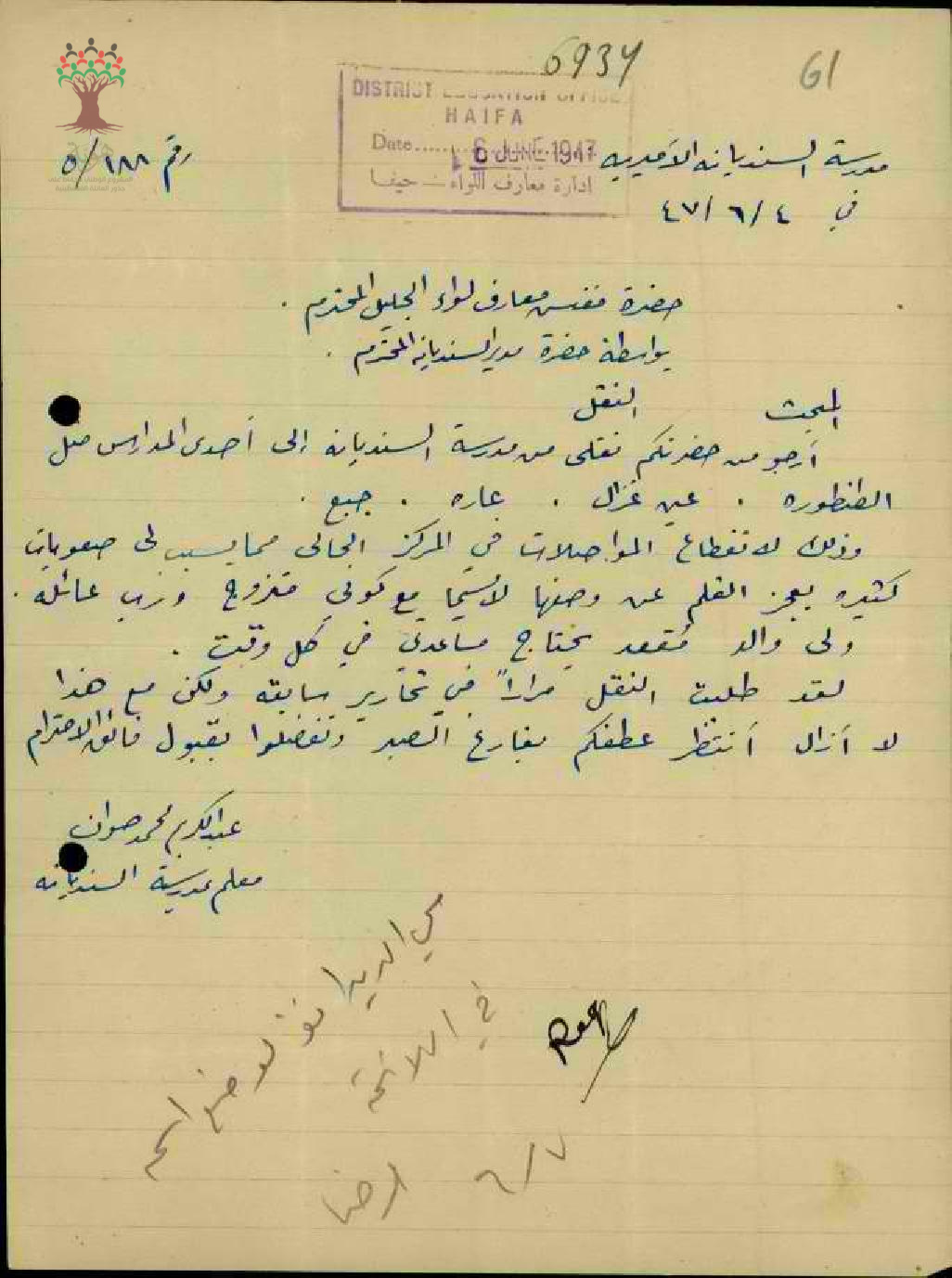 رسالة من المعلم عبد الكريم صوان الى مفتش المعارف يطلب نقله من مدرسة السنديانة