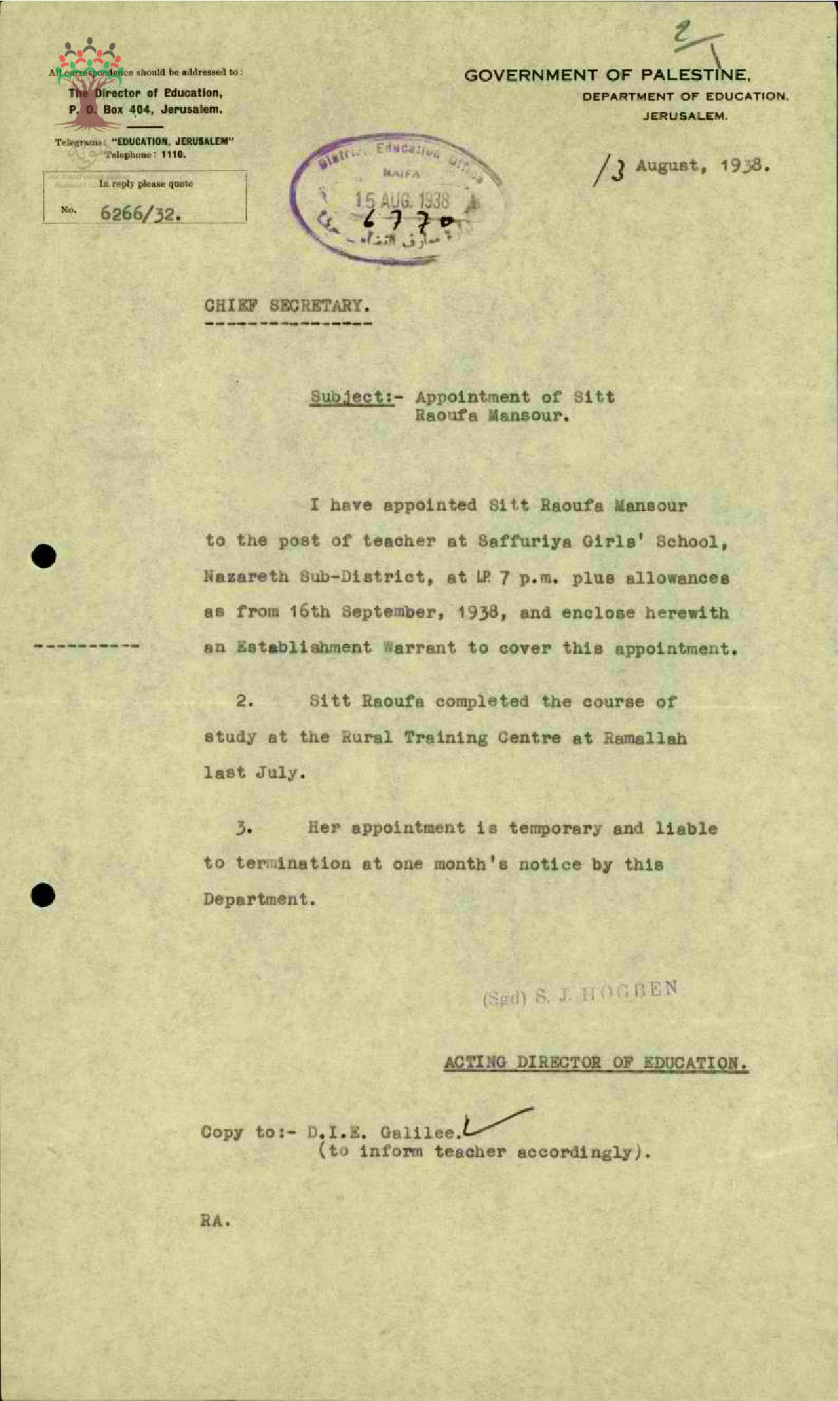 رسالة من مدير المعارف الى رئيس السكرتارية بخصوص تعيين المعلمة رؤوفة منصور