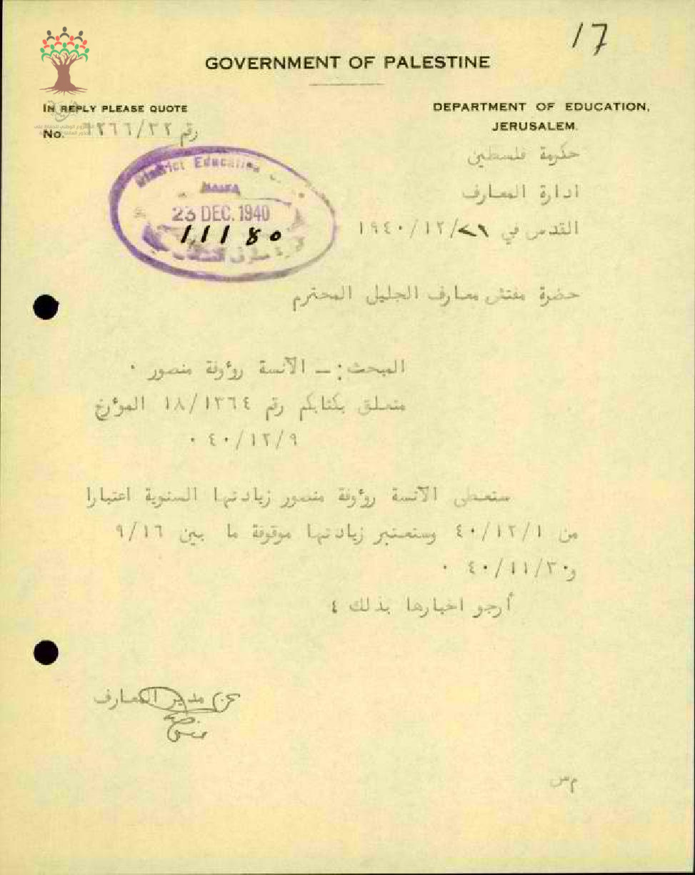 رسالة من مدير المعارف الى مفتش المعارف بخصوص اعادة الزيادة السنوية للمعلمة رؤوفة منصور