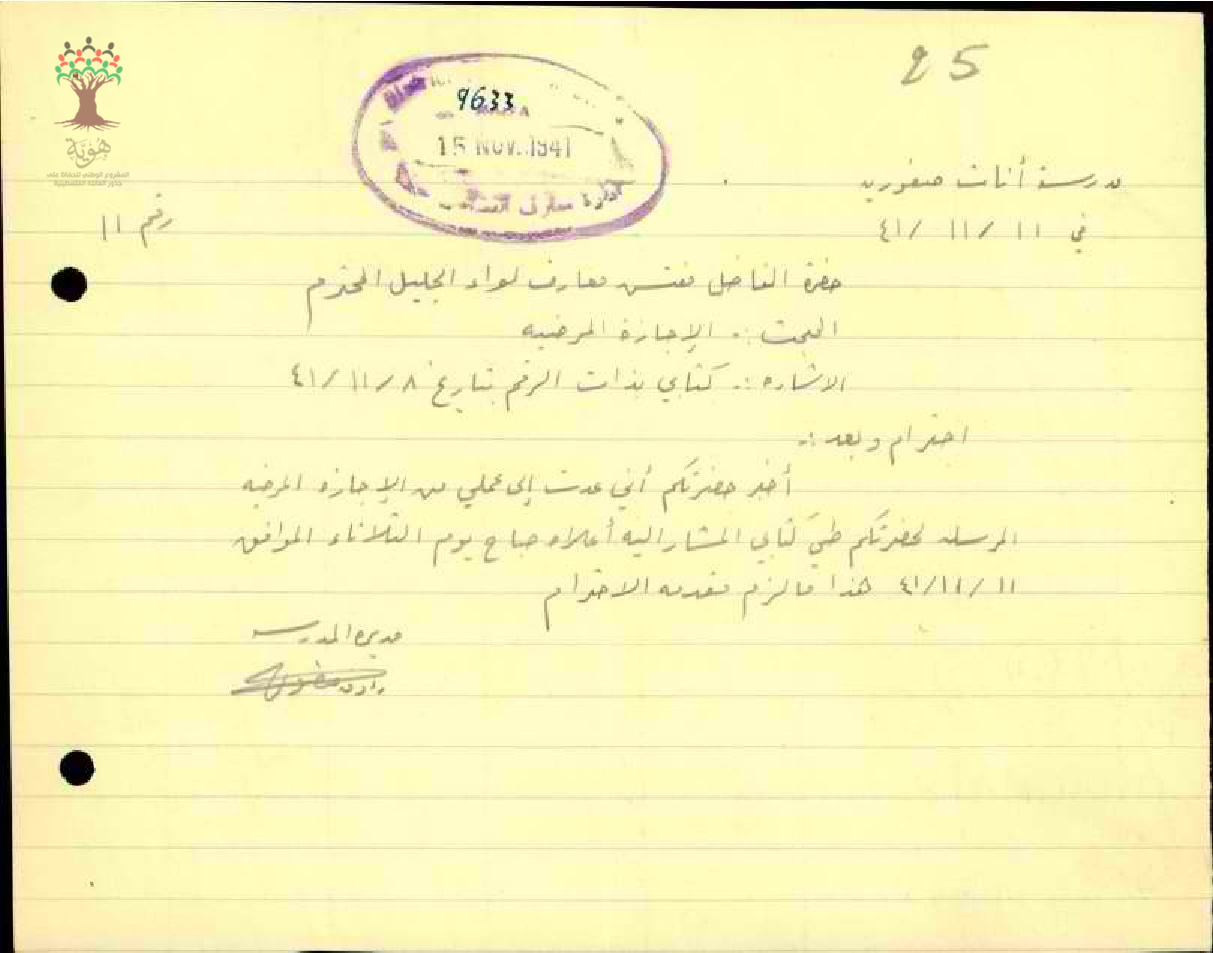 رسالة من المعلمة رؤوفة منصور الى مفتش المعارف تخبره بعودتها الى العمل