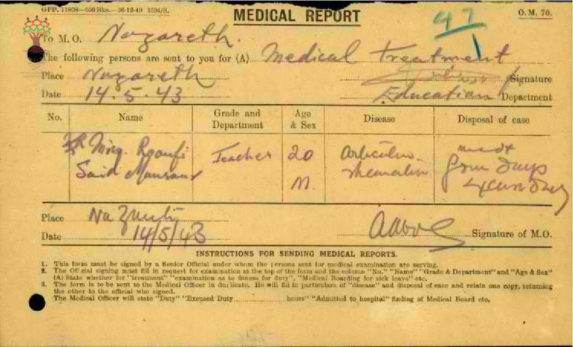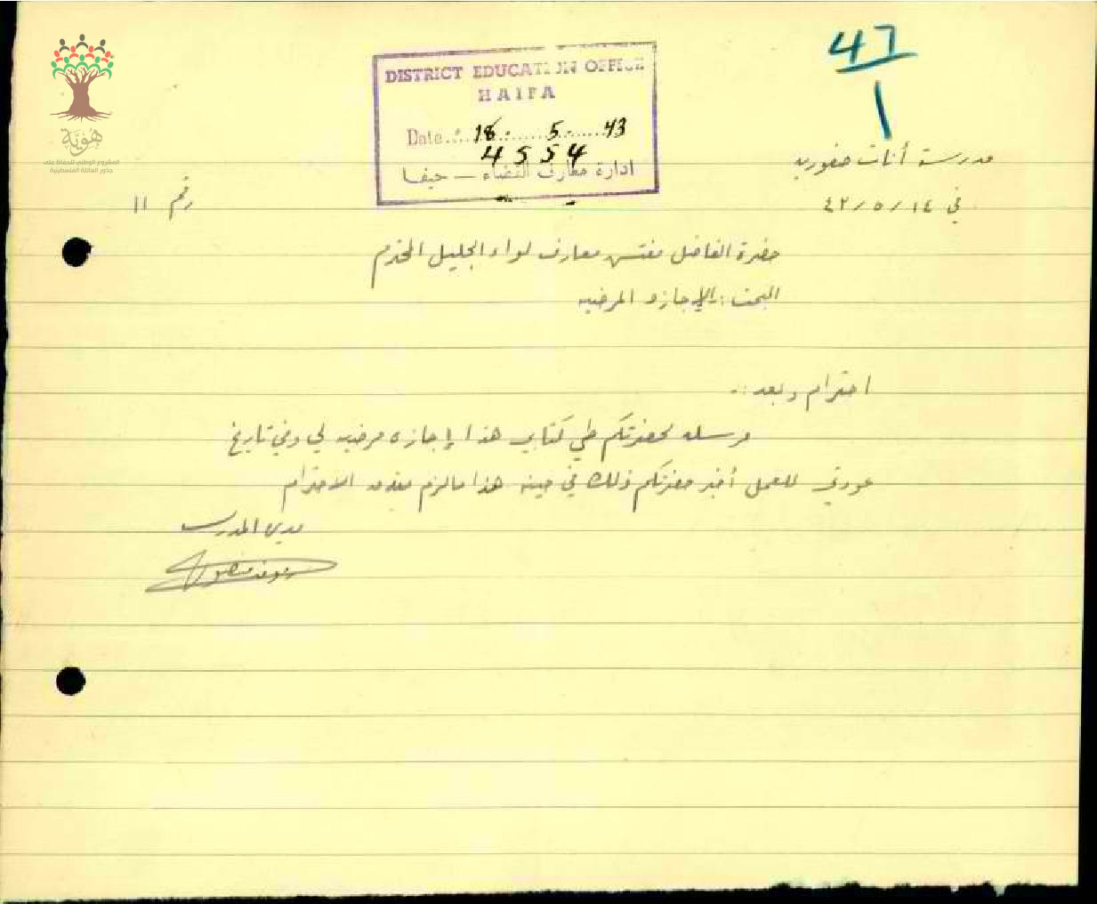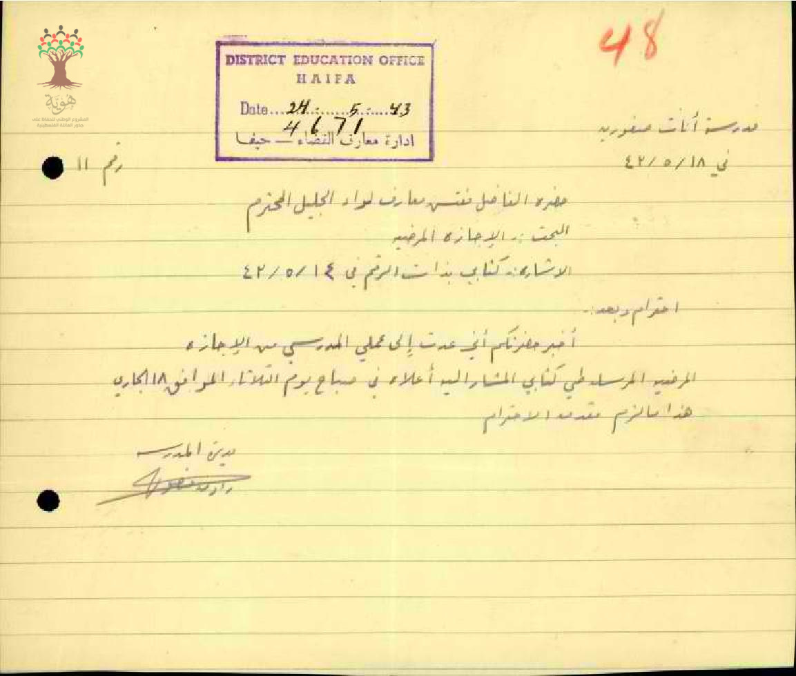 رسالة من المعلمة رؤوفة منصور الى مفتش المعارف بخصوص اجازة مرضية مرفقة بالتقرير الطبي وعودتها الى العمل