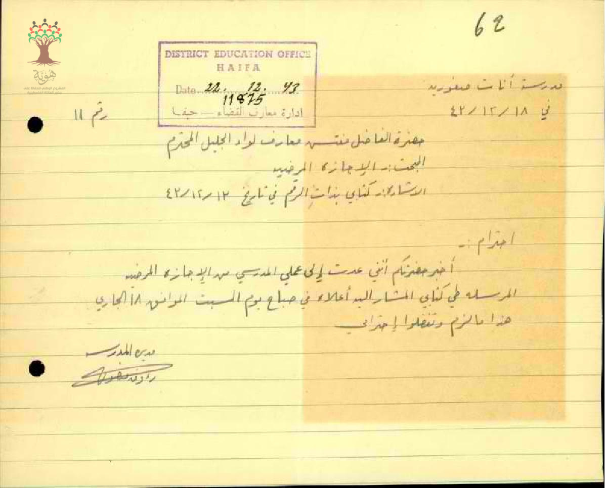 رسالة من المعلمة رؤوفة منصور الى مفتش المعارف تخبره بعودتها الى العمل