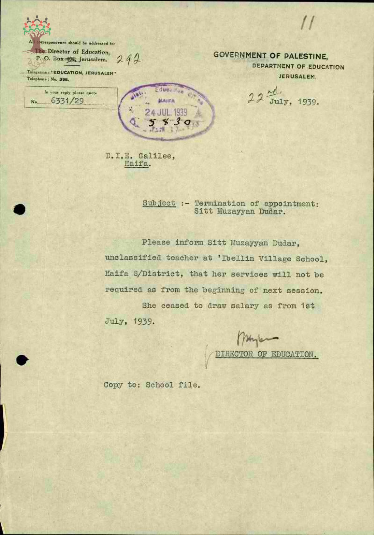 رسالة من مدير المعارف الى مفتش المعارف بخصوص بداية خدمة المعلمة مزين دودار