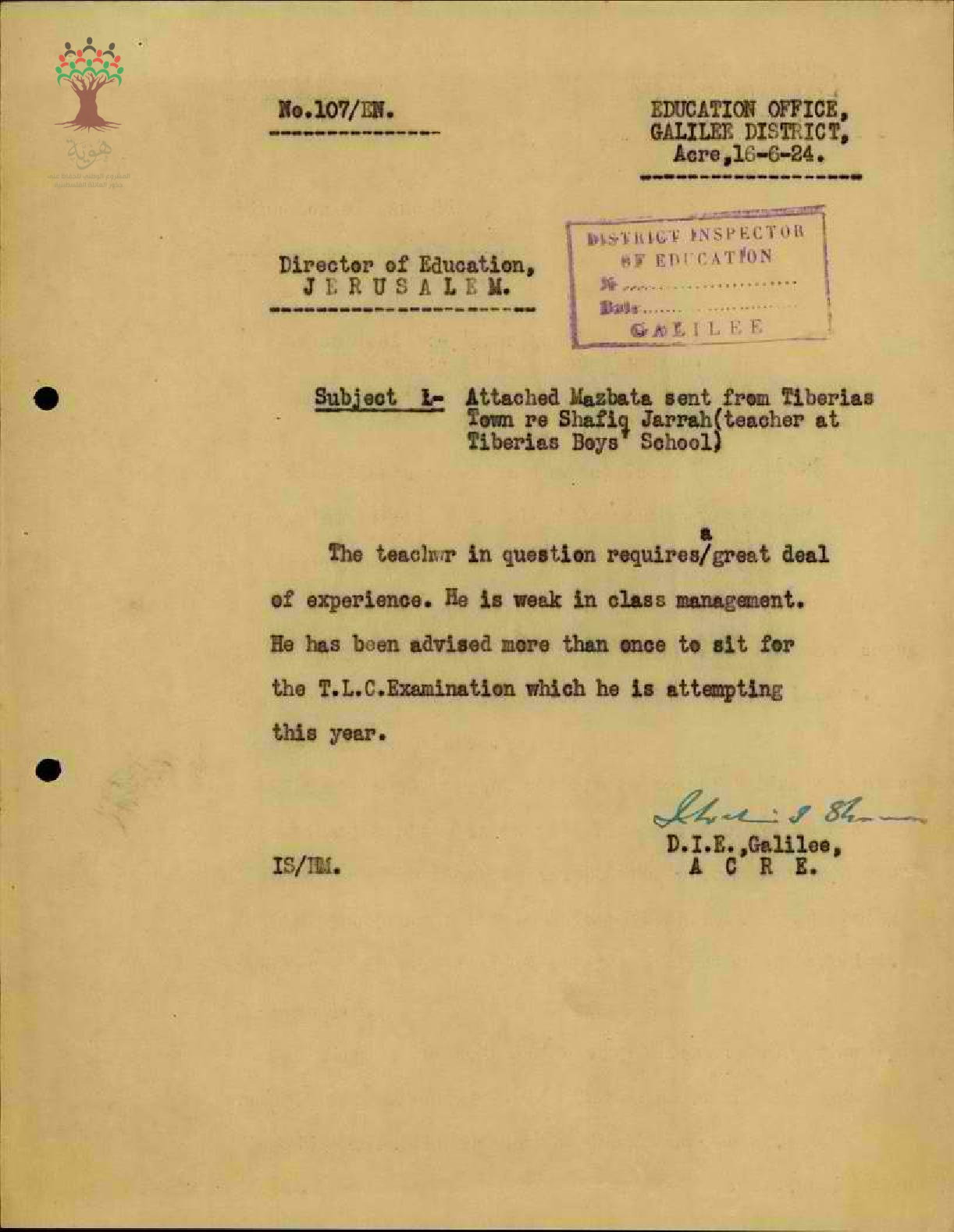 رسالة من مفتش المعارف الى مدير المعارف بخصوص ضرورة تحسين أداء المعلم شفيق الجراح
