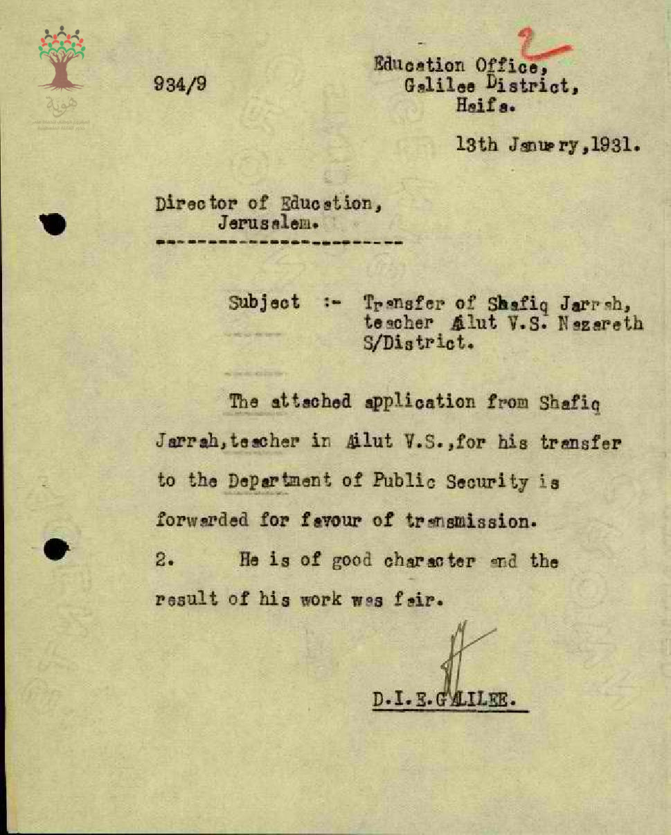 رسالة من مفتش المعارف الى مدير المعارف بخصوص رغبة المعلم شفيق جراح بالانتقال الى سلك البوليس