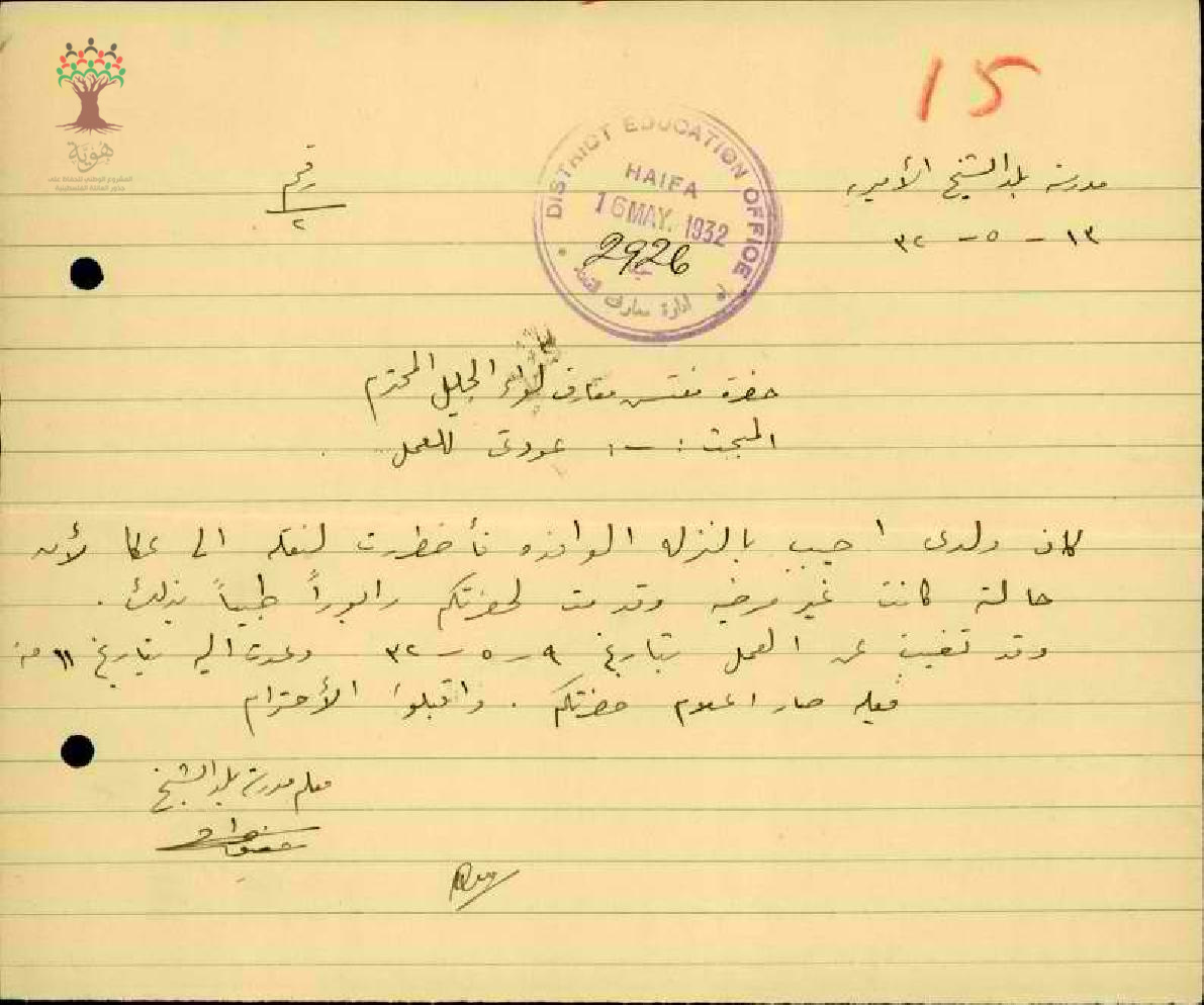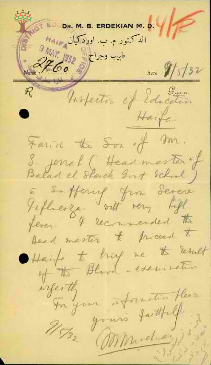 رسالة من المعلم شفيق جراح الى مفتش المعارف بخصوص تغيبه عن العمل مرفقة بالتقرير الطبي عن مرض ابنه