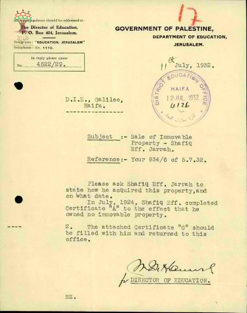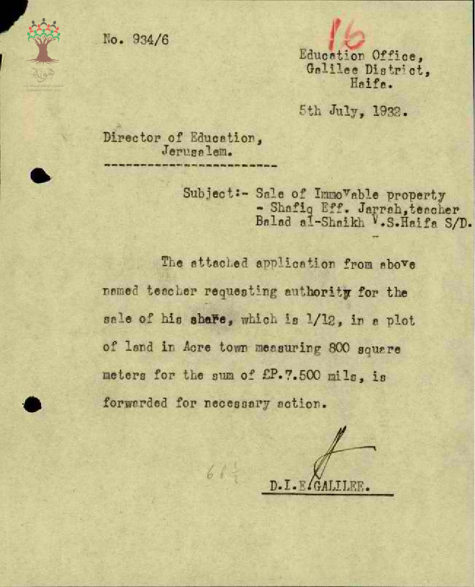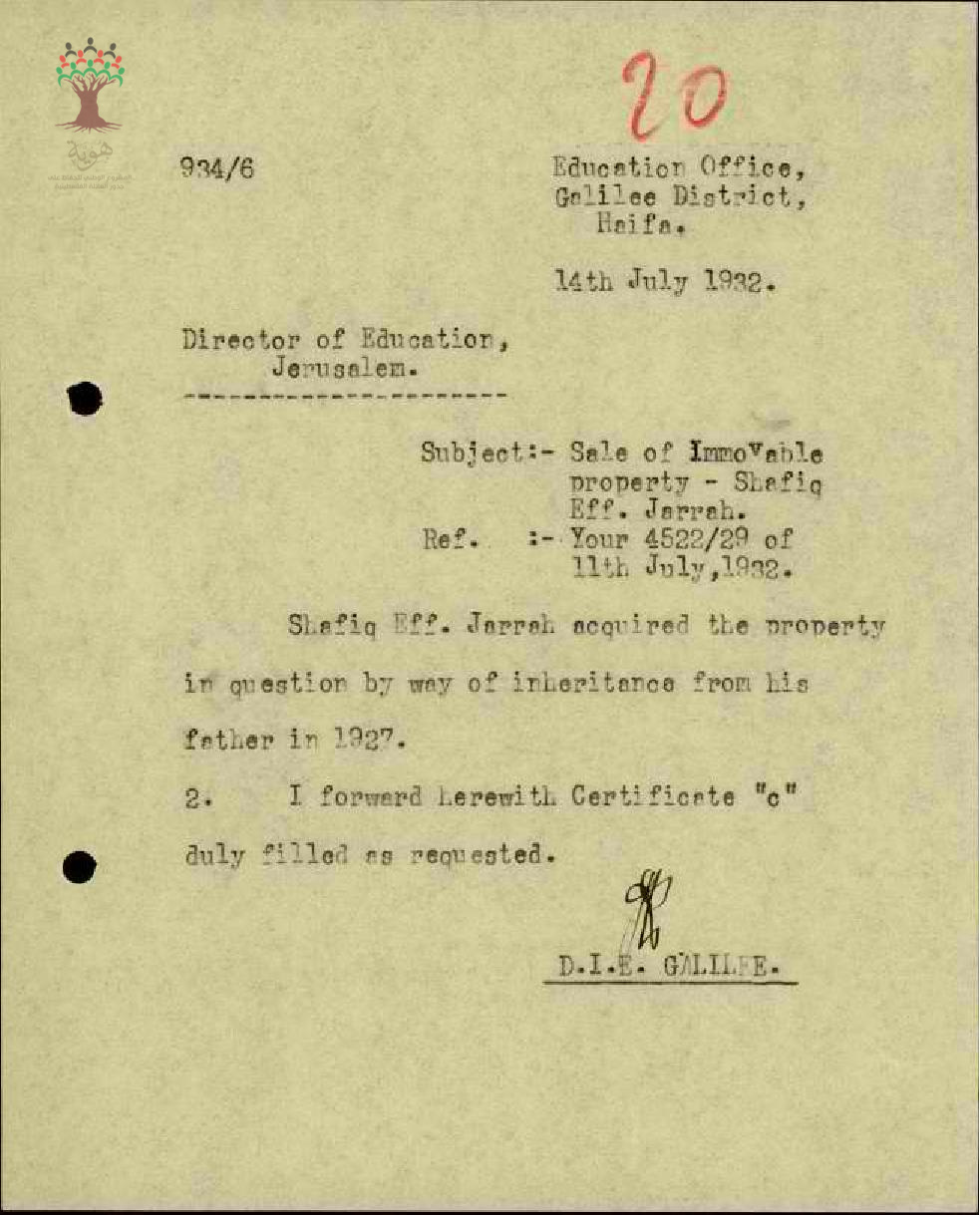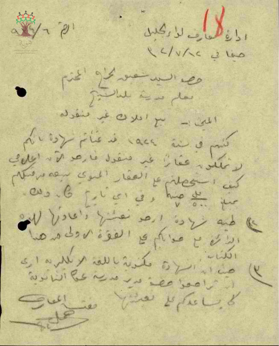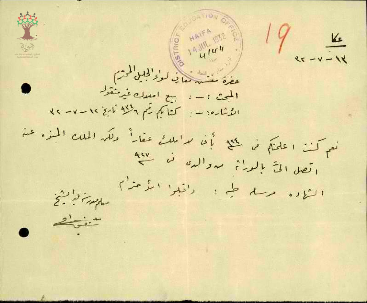 مجموعة رسائل بخصوص بيع املاك غير منقولة للمعلم شفيق جراح