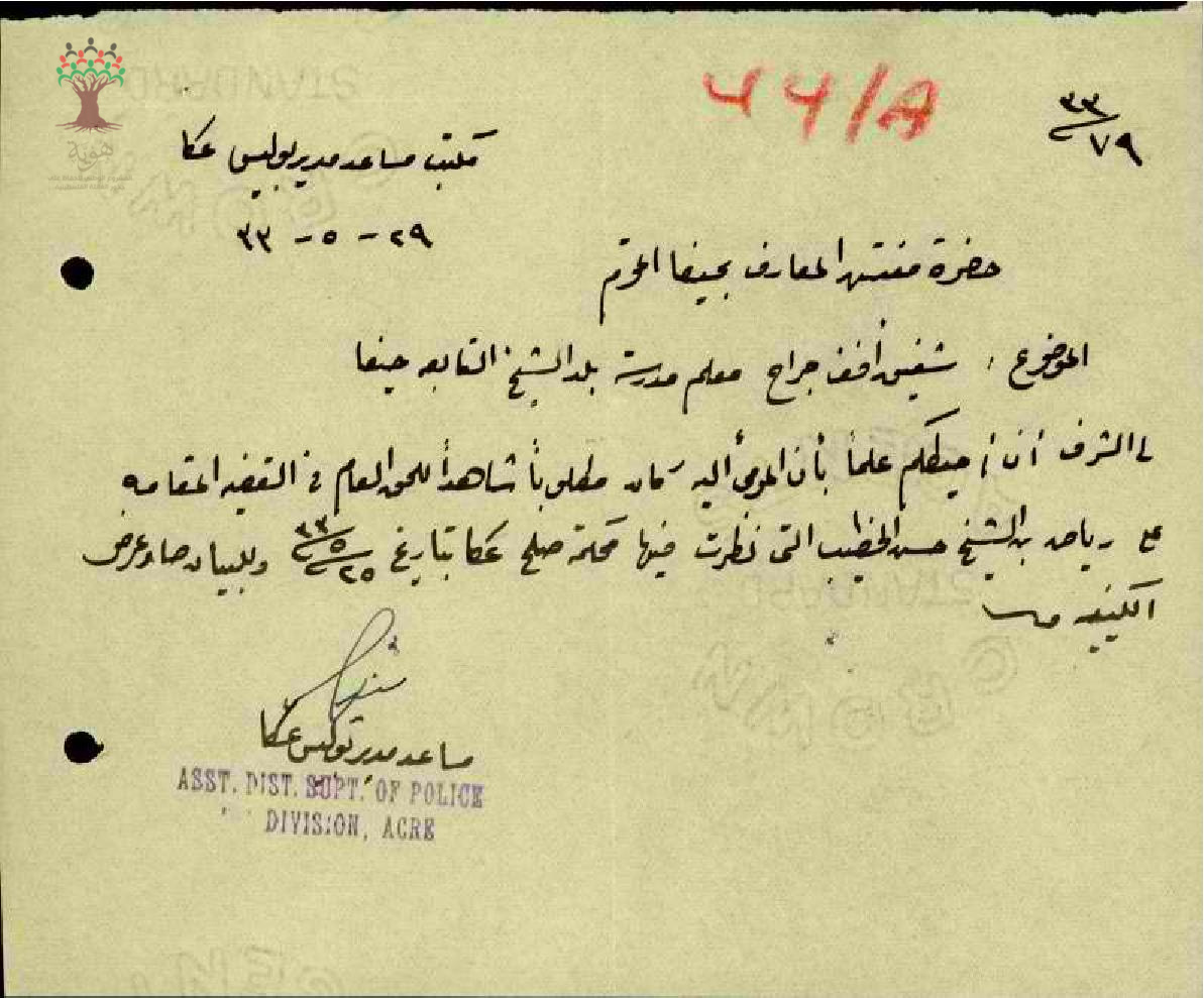 رسالة ن مساعد مدير البوليس الى مفتش المعارف يخبره بأن المعلم شفيق جراح مطلوب للشهادة في محكمة صلح عكا