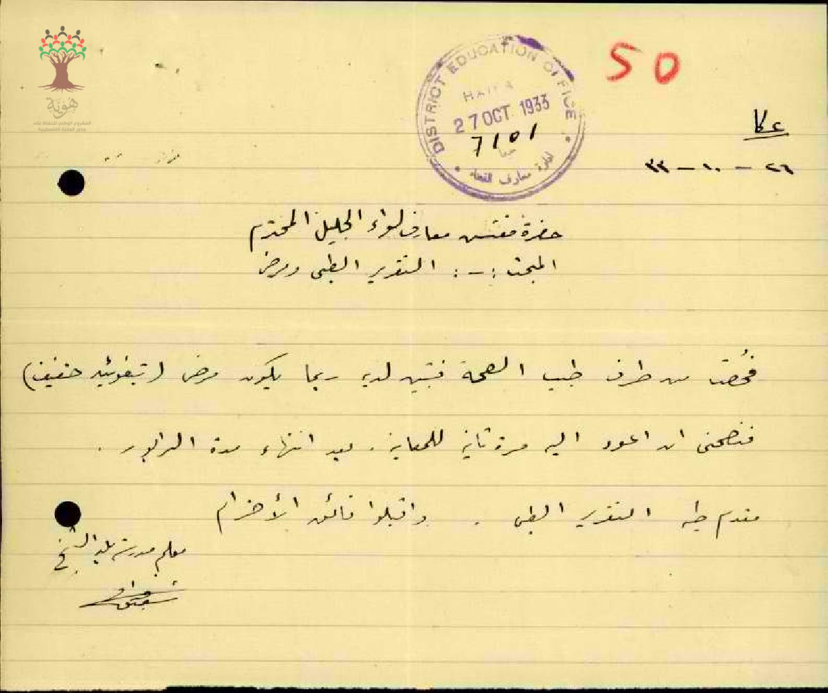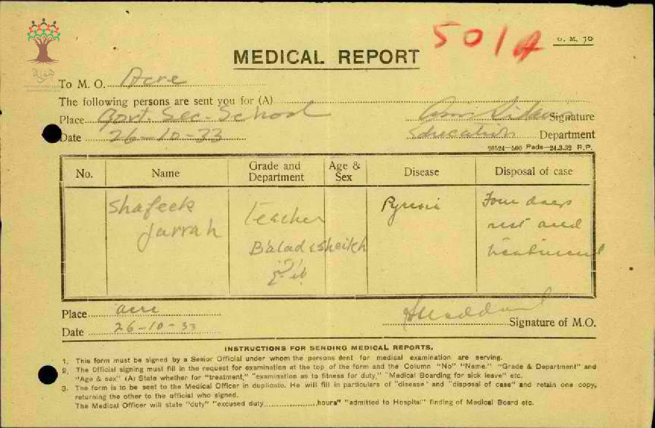 رسالة من المعلم شفيق جراح الى مفتش المعارف بخصوص تغيبه عن العمل مرفقة بالتقرير الطبي