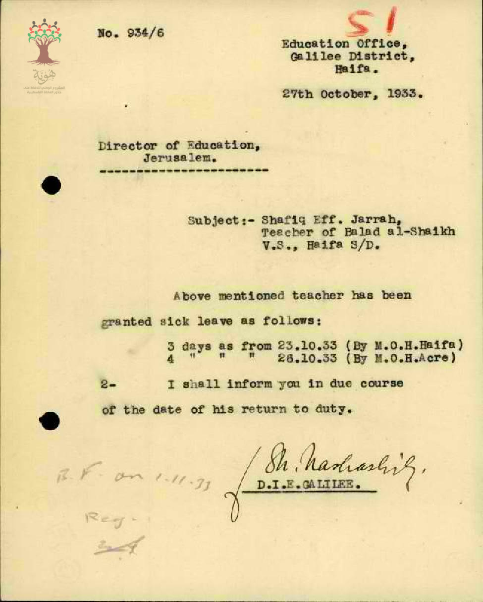 رسالة من مفتش المعارف الى مدير المعارف بخصوص تغيب المعلم شفيق جراح عن العمل بسبب اصابته بالملاريا