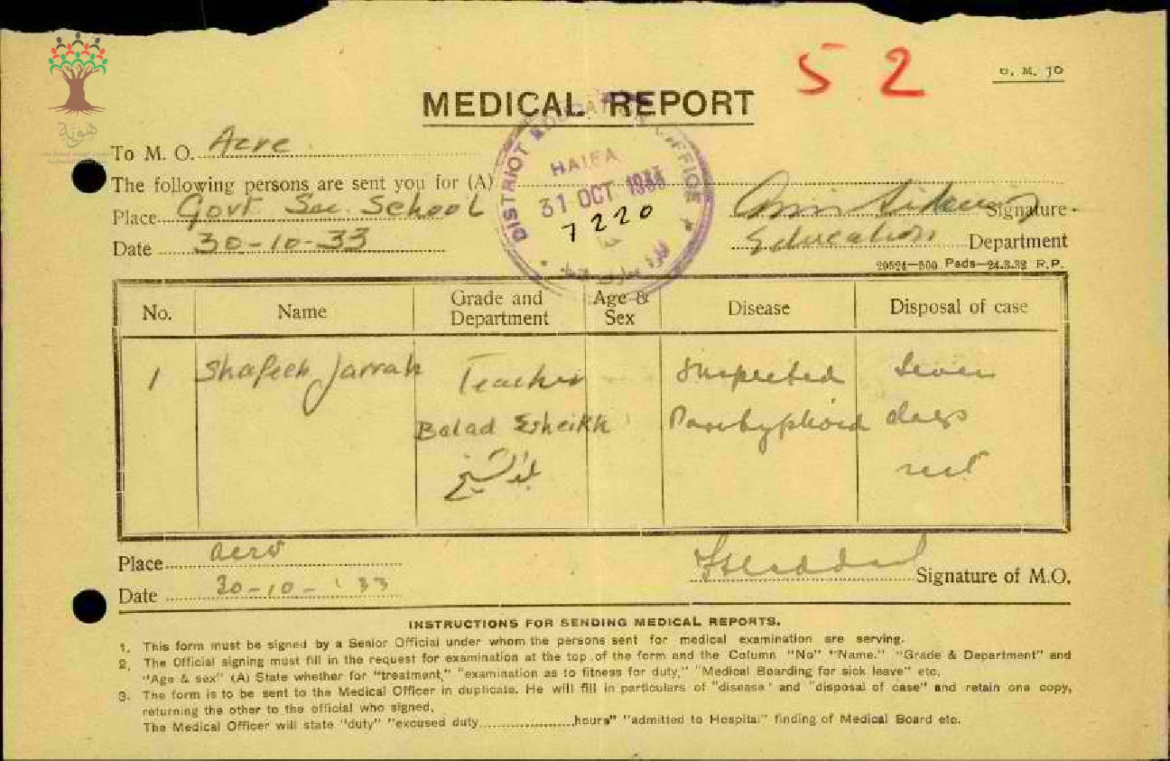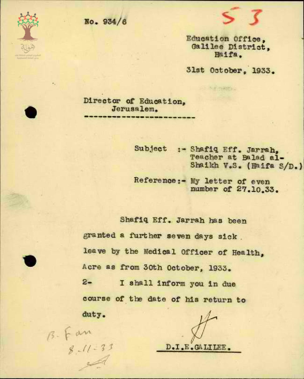 رسالة من مفتش المعارف الى مدير المعارف بخصوص تغيب المعلم شفيق جراح مرفقة بالتقرير الطبي