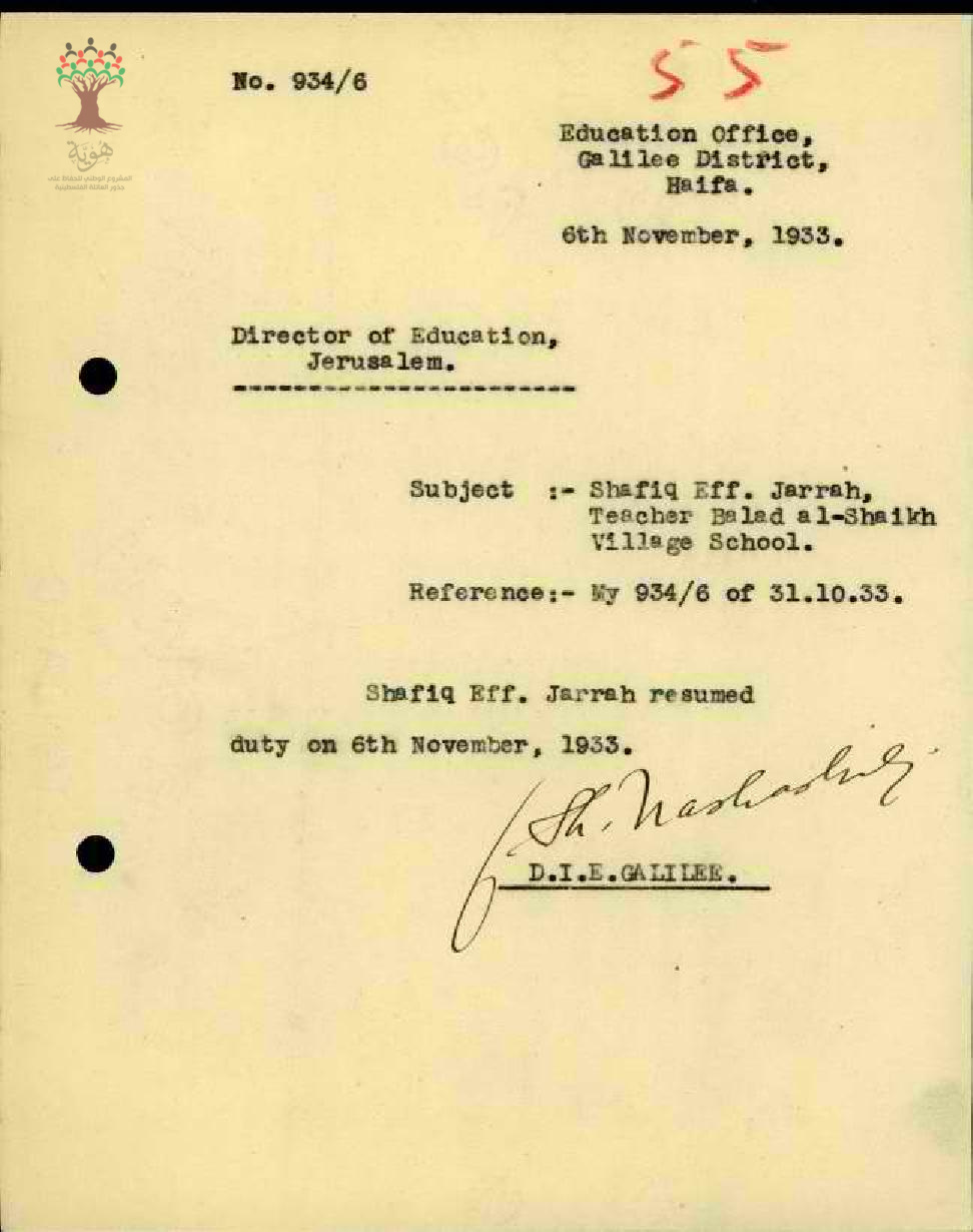 رسالة من مفتش المعارف الى مدير المعارف بخصوص عودة المعلم شفيق جراح الى العمل