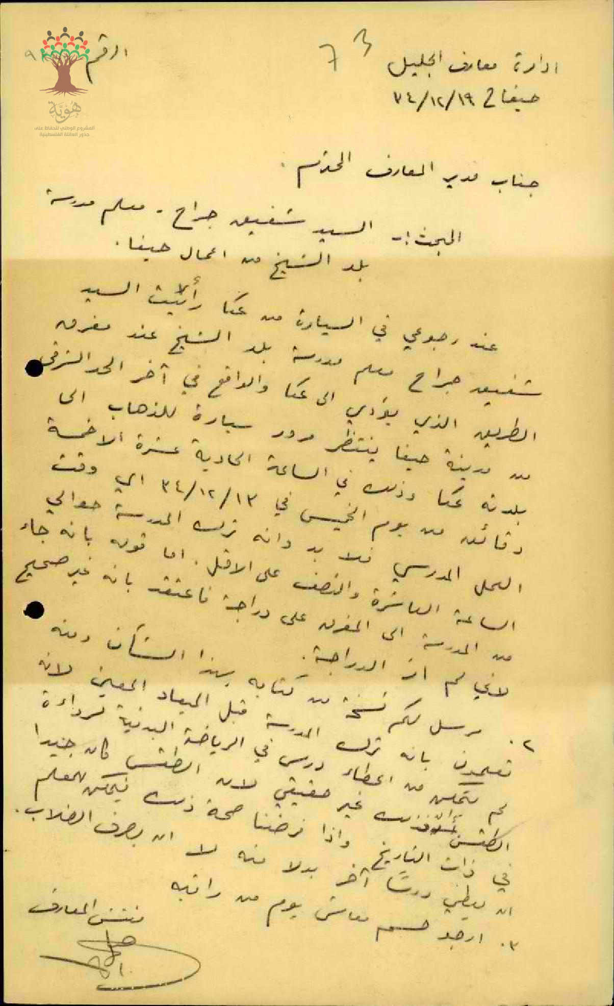 رسالة من مفتش المعارف الى مدير المعارف يعلمه بان المعلم شفيق جراح قد اقفل مدرسته دون علم مسبق