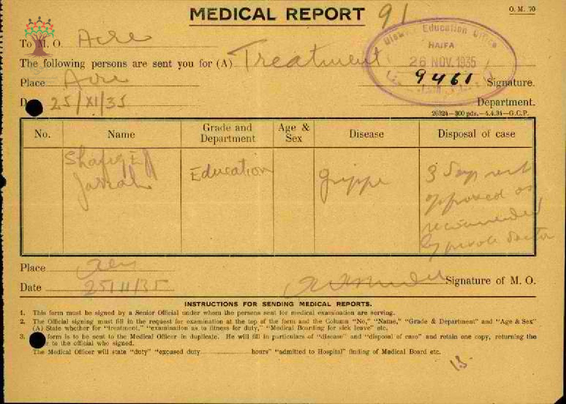تقارير طبية عن غياب المعلم شفيق جراح مدرسة بلد الشيخ-عكا