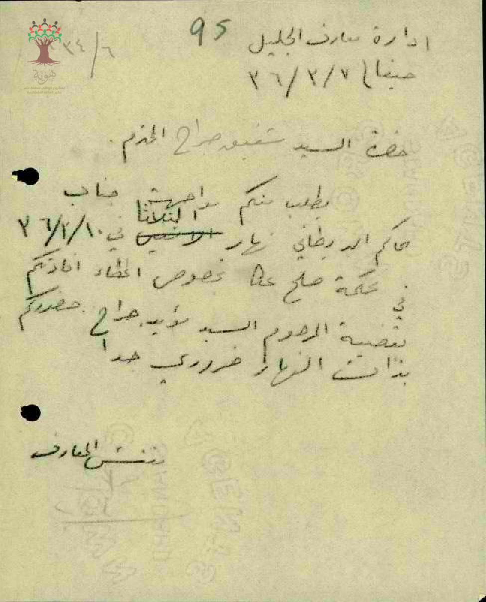 رسالة من مفتش المعارف الى المعلم شفيق جراح يخبره بأنه مطلوب للافادة في المحكمة