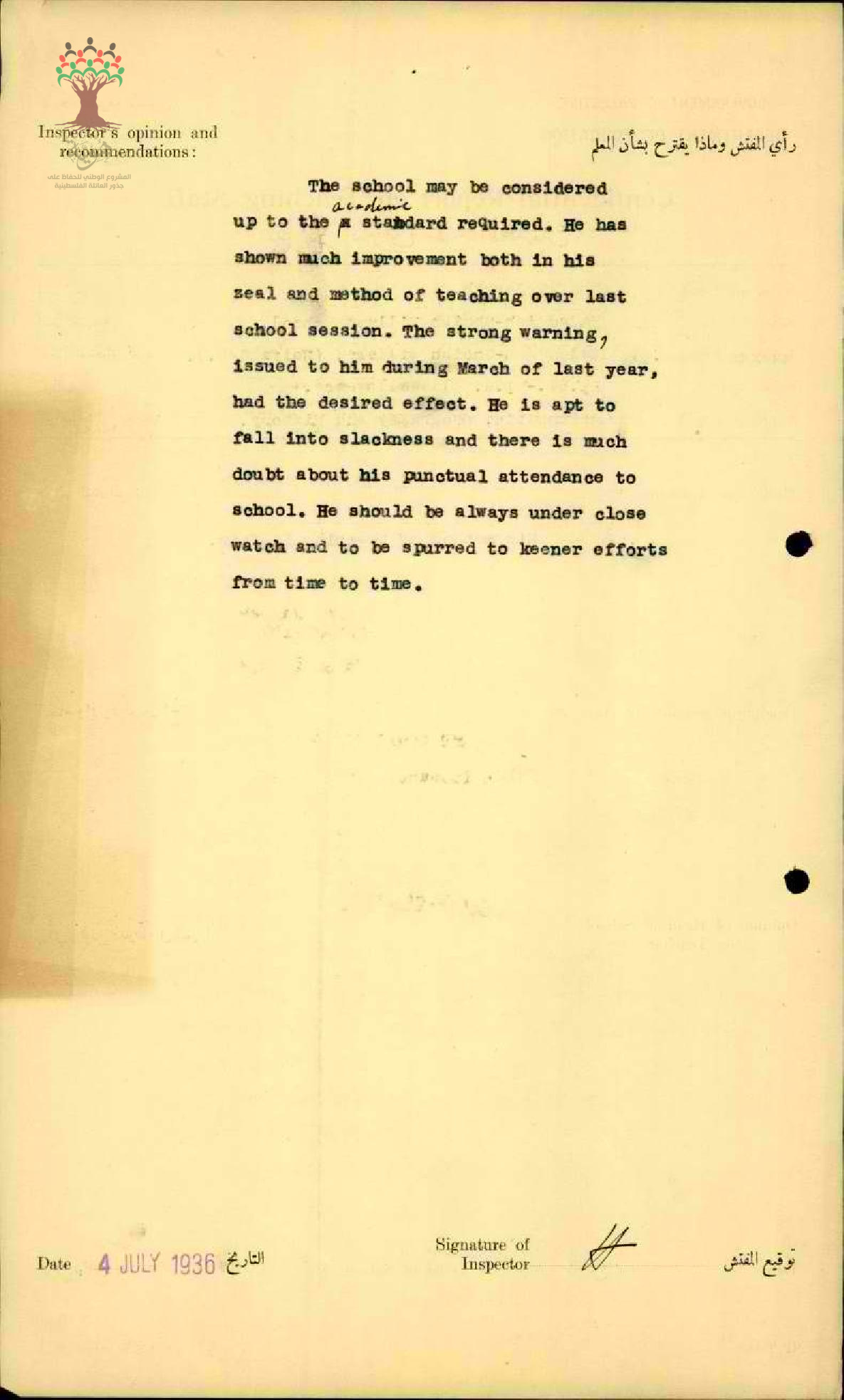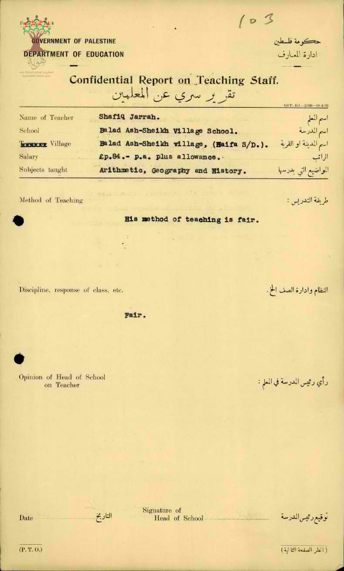 تقرير تفصيلي عن أداء المعلم شفيق جراح في مدرسة بلد الشيخ سنة 1936