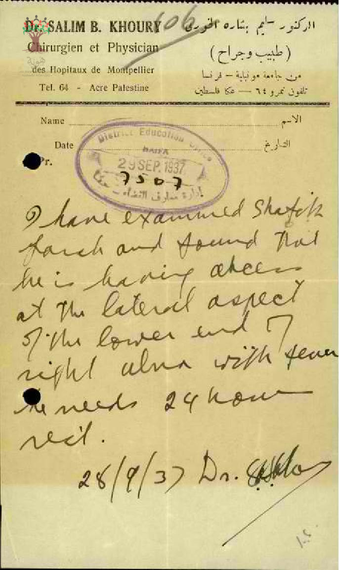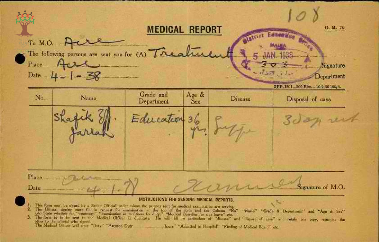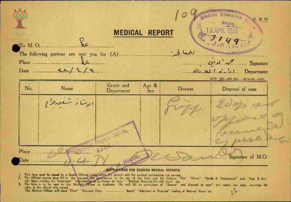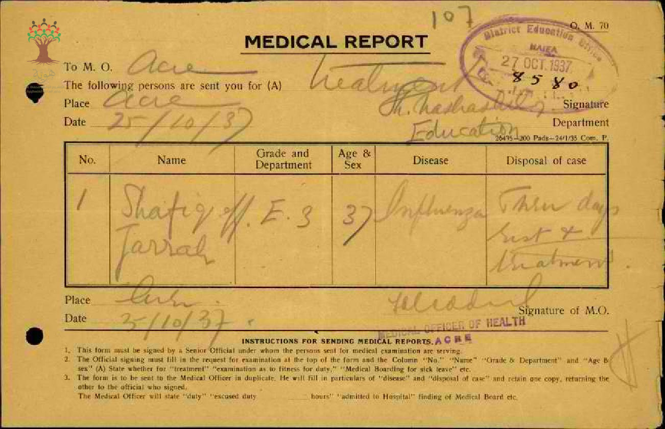 تقارير طبية عن غياب المعلم شفيق جراح مدرسة بلد الشيخ-عكا