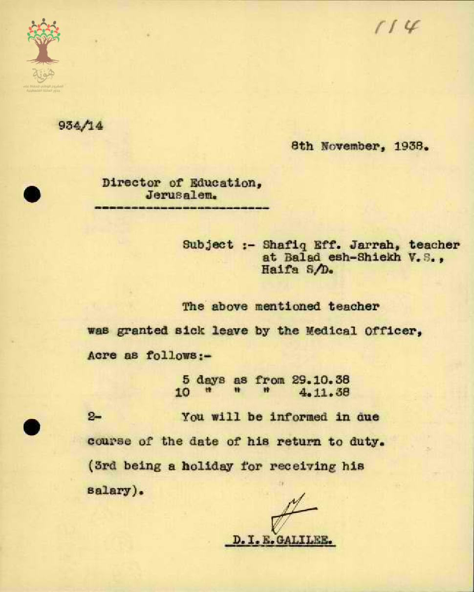 رسالة من مفتش المعارف الى مدير المعارف بخصوص اجازة مرضية للمعلم شفيق جراح
