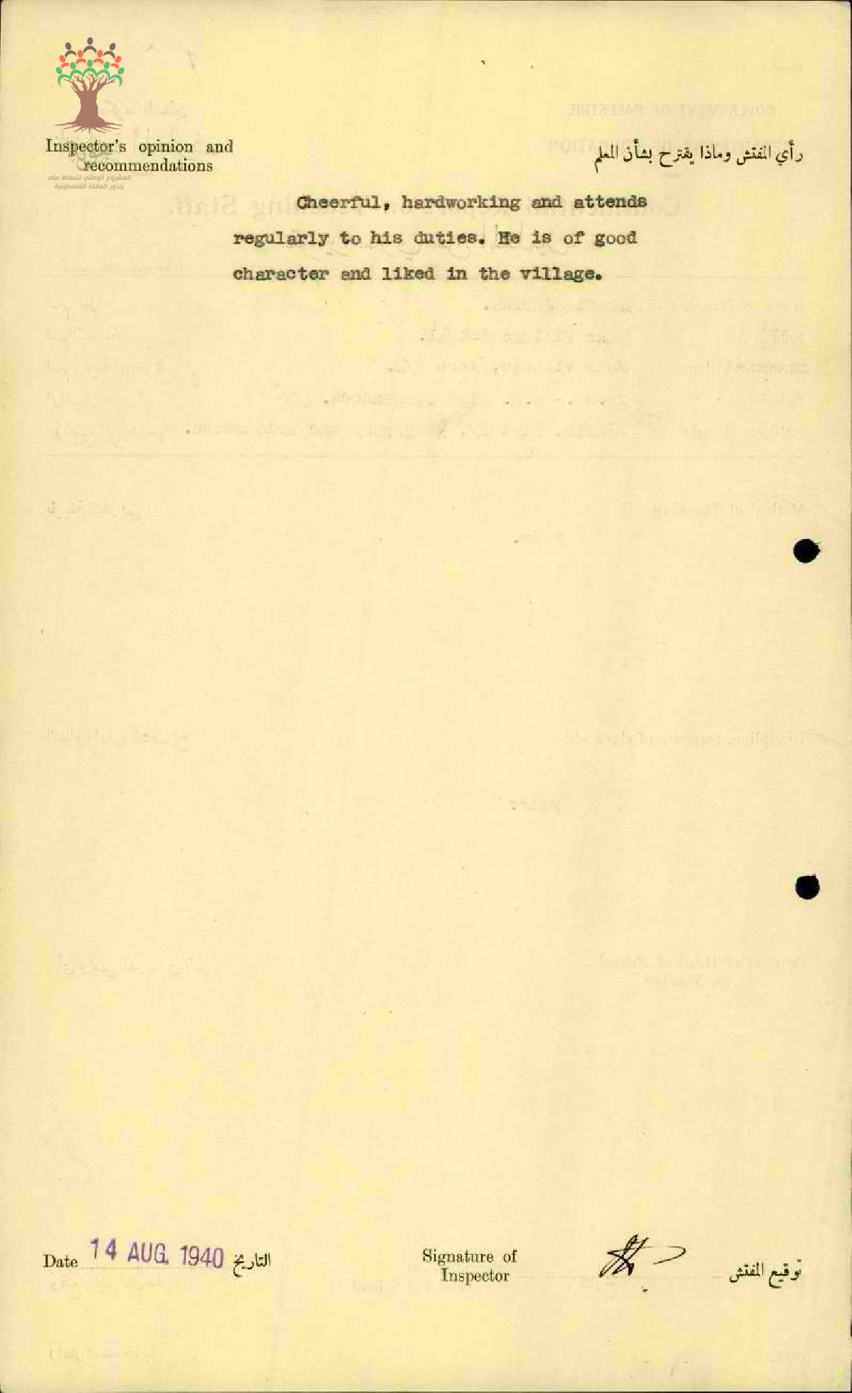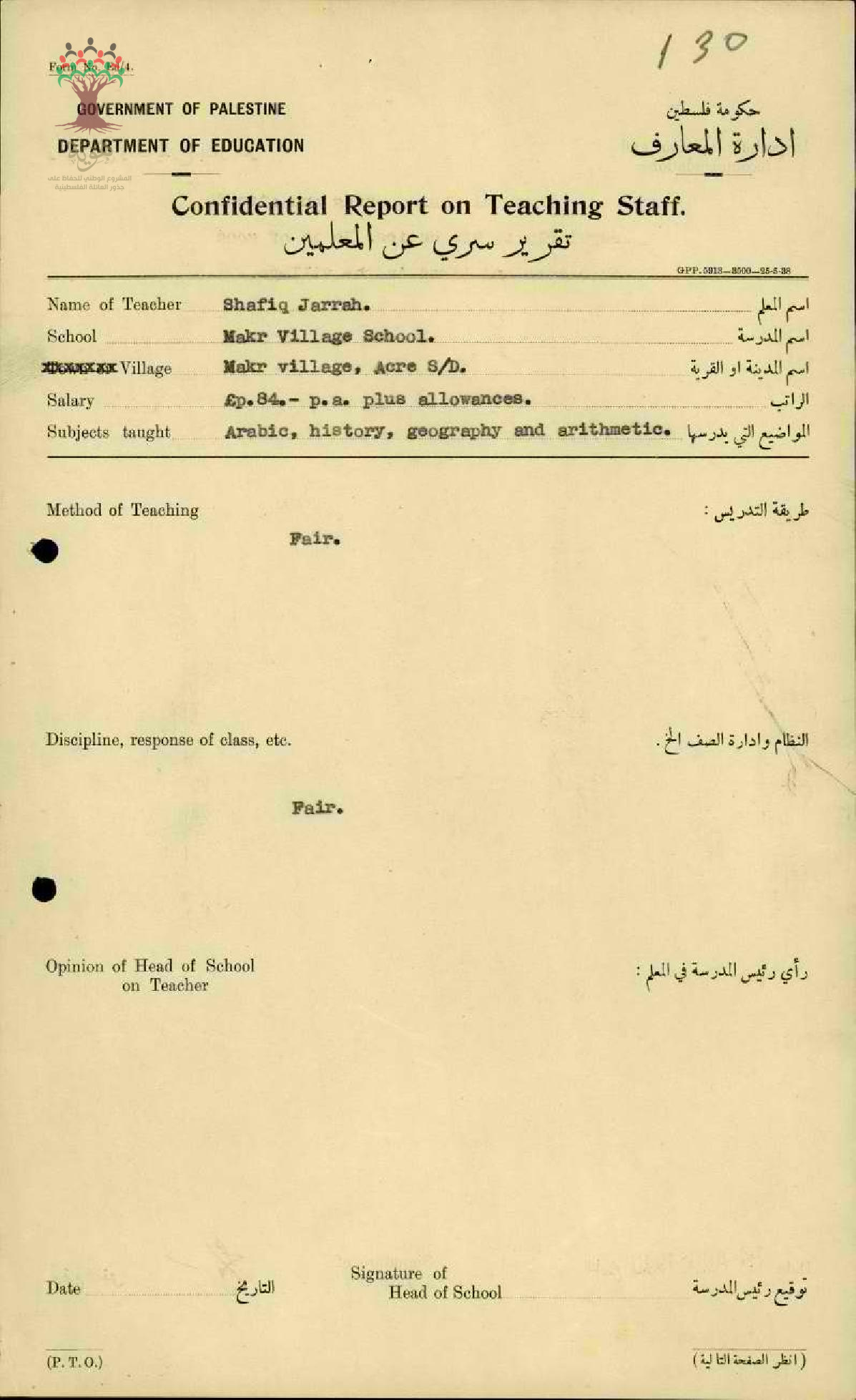 تقرير تفصيلي عن أداء المعلم شفيق جراح في مدرسة المكر سنة 1940