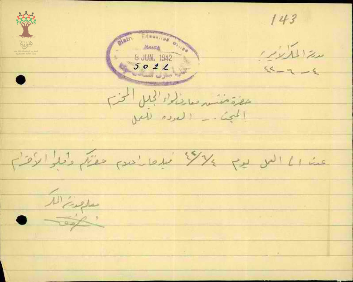 رسالة من المعلم شفيق جراح الى مفتش المعارف يخبره بعودته الى العمل