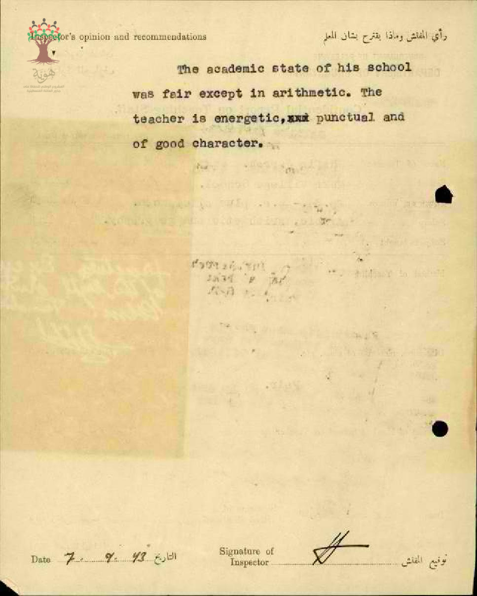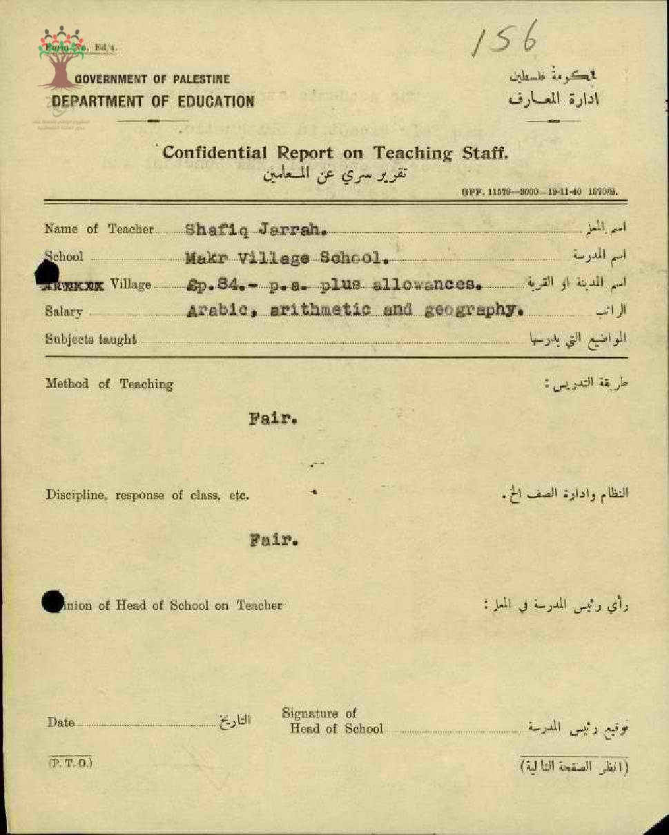 تقرير تفصيلي عن أداء المعلم شفيق جراح في مدرسة المكر سنة 1943