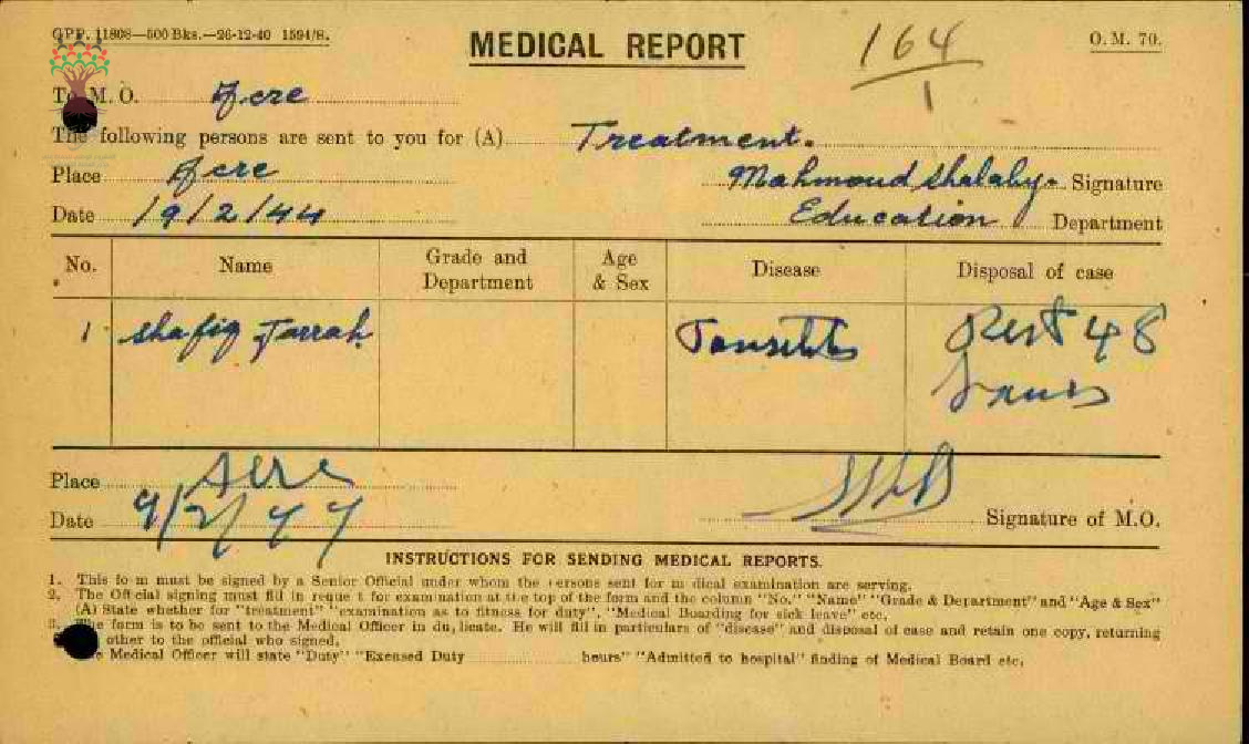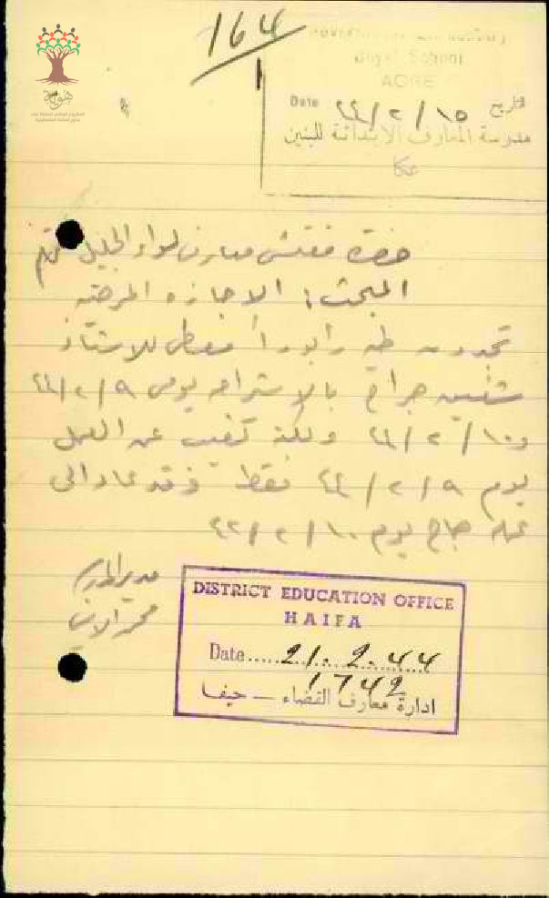 رسالة من مدير مدرسة عكا الى مفتش المعارف بخصوص تغيب المعلم شفيق جراح مرفقة بالتقرير الطبي