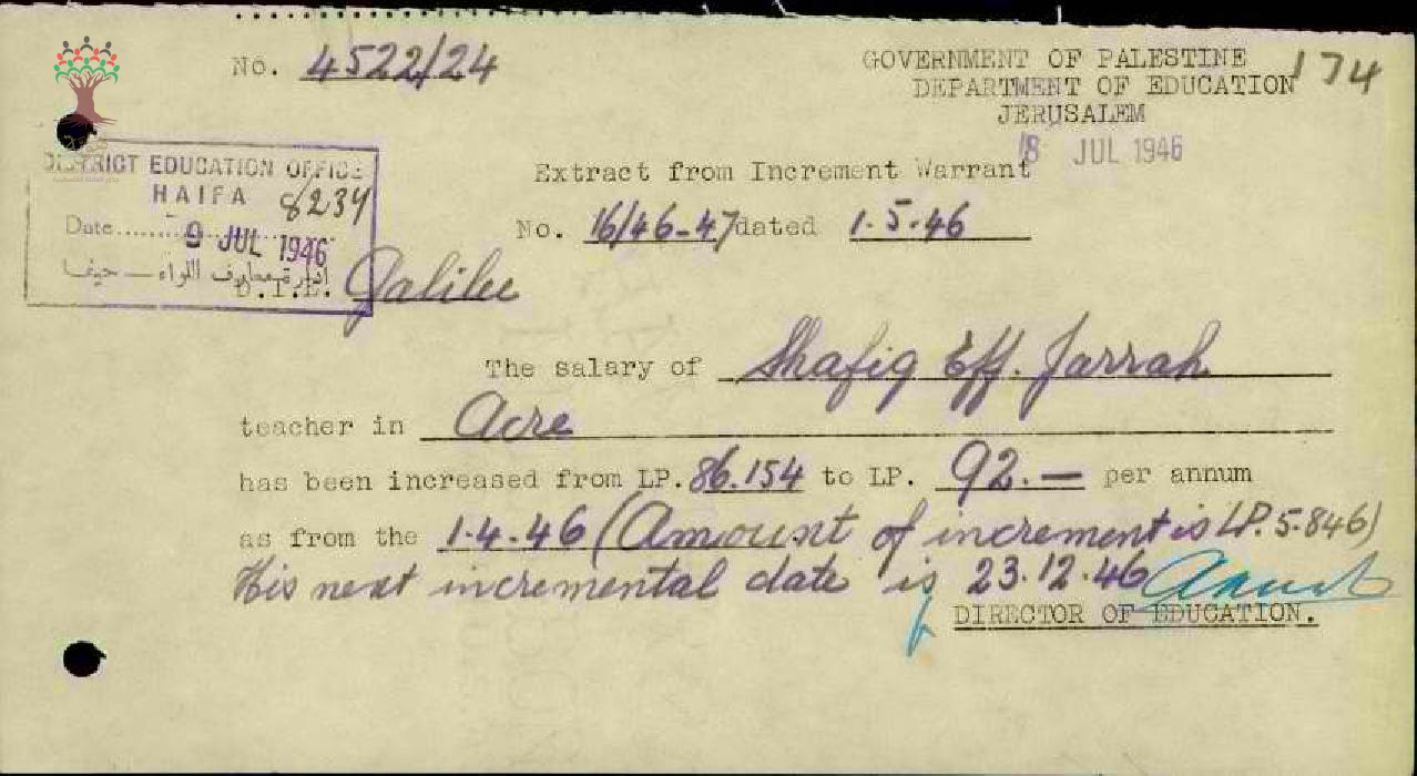 رسالة من مدير المعارف الى مفتش المعارف بخصوص زيادة راتب المعلم شفيق جراح السنوية