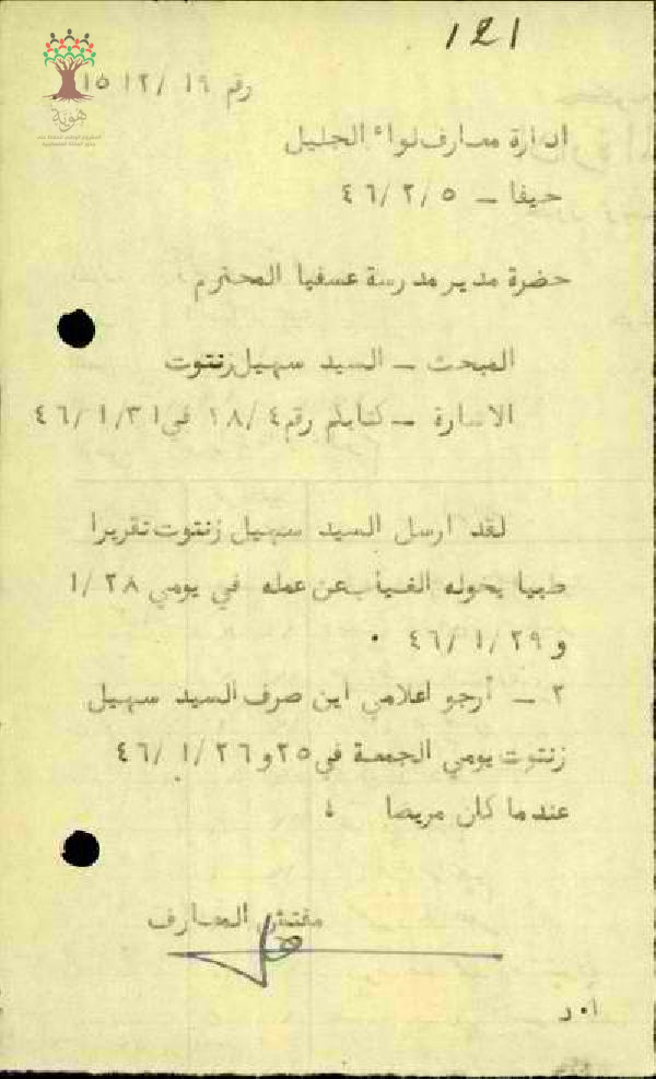طلب مفتش المعارف معلومات حول غياب المعلم سهيل زنتوت لمعرفة المكان الذي كان فيه اثناء مرضه