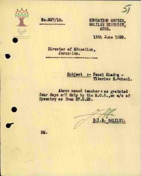 رسالة من مفتش المعارف الى مدير المعارف بخصوص اجازة مرضية للمعلم فوزي الخضرا