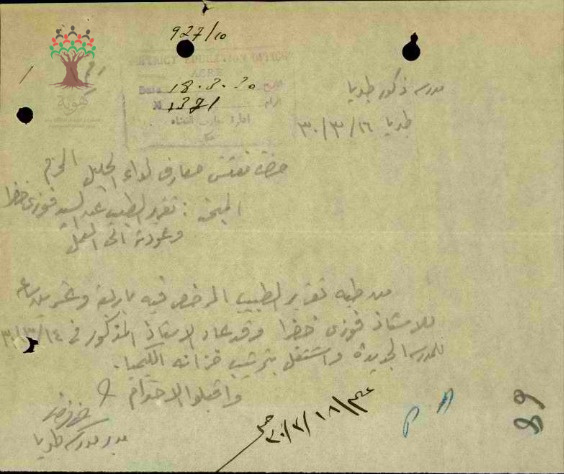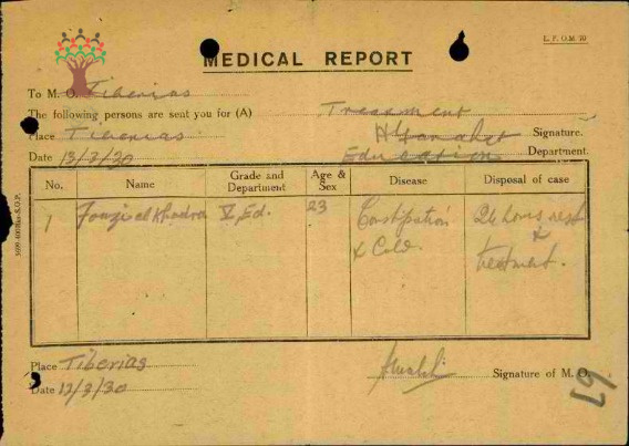 رسالة من مدير مدرسة طبريا الى مفتش المعارف بخصوص تغيب المعلم فوزي الخضرا بسبب المرض مرفقة بالتقرير الطبي وعودته الى العمل