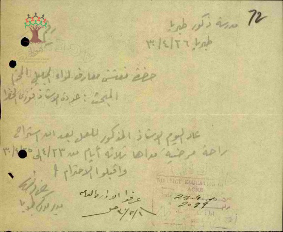 رسالة من مدير مدرسة طبريا الى مفتش المعارف بخصوص عودة المعلم فوزي الخضرا الى العمل