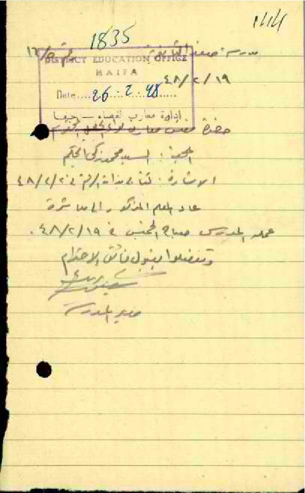 رسالة من مدير مدرسة صفدالثانوية إلى مفتش المعارف بخصوص عودة المعلم محمد زكي الحكيم إلى عمله في المدرسة