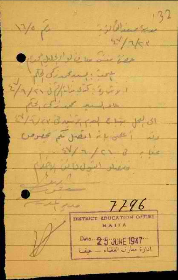 رسالة من مدير المدرسة إلى حضرة مفتش المعارف لواء الجليل المحترم بخصوص عودة المعلم محمد زكي الحكيم إلى عمله