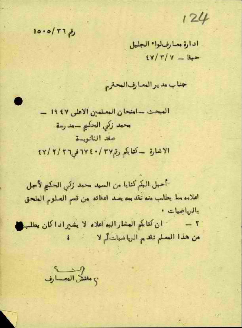 رسالة من مفتش المعارف الى مدير المعارف بشان المعلم محمد زكي الحكيم