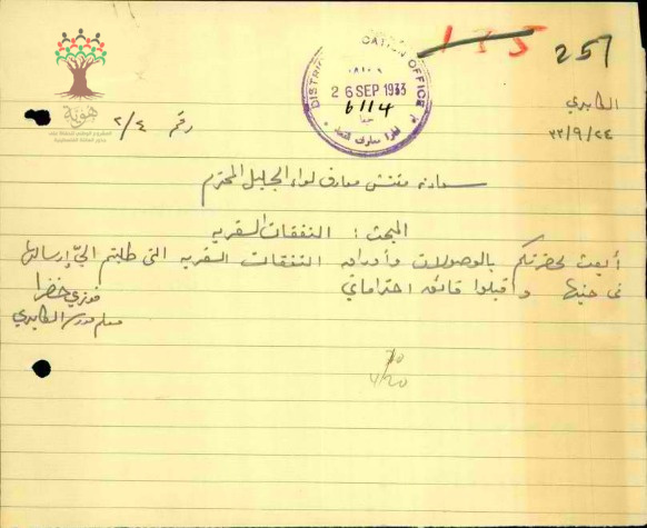 رسالة من المعلم فوزي الخضرا الى مفتش المعارف يطلب فيها مصاريف سفره الى الكابري