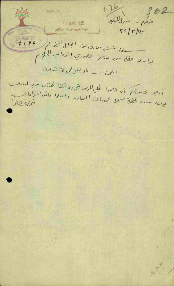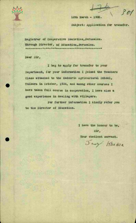 رسالة من المعلم فوزي الخضرا الى مفتش المعارف مرفقة بطلب الى مسجل جمعيات التعاون يطلب فيها نقله الى جمعيات التعاون