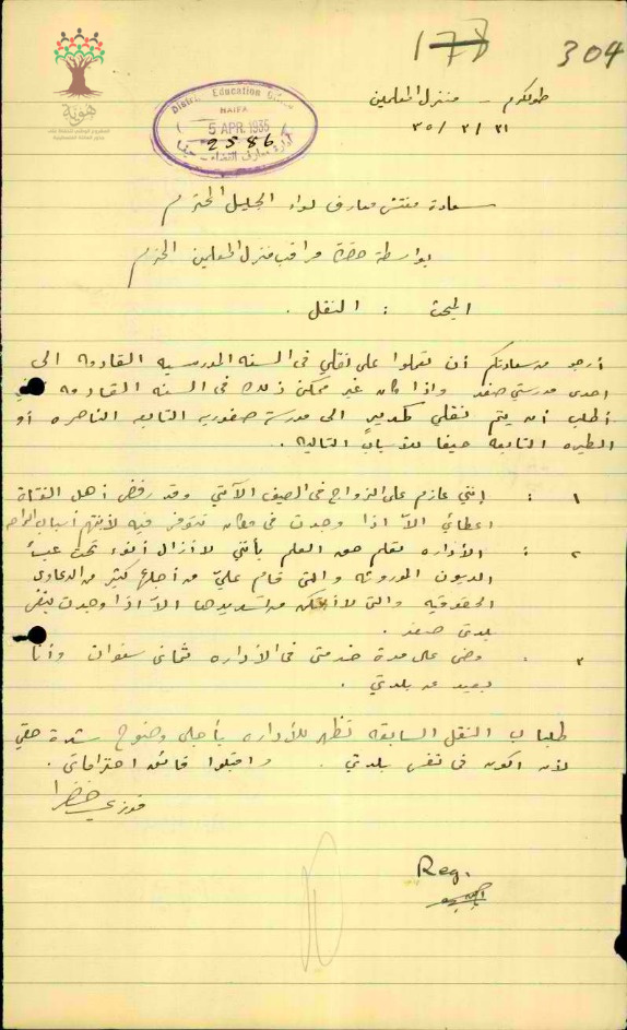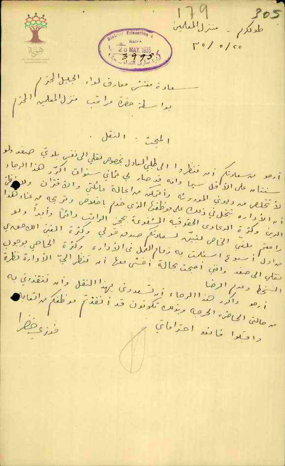 رسائل مخن المعلم فوزي الخضرا الى مفتش المعارف يطلب فيها نقله من مدرسة الكابري