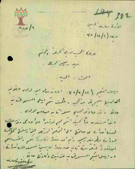رسالة من مفتش المعارف الى المعلم فوزي الخضرا بخصوص الدين المترتب عليه