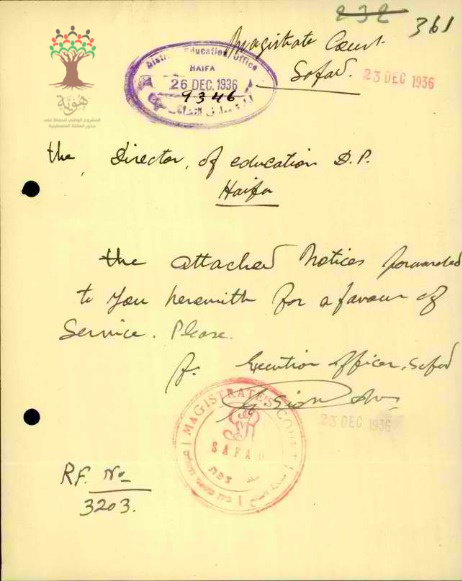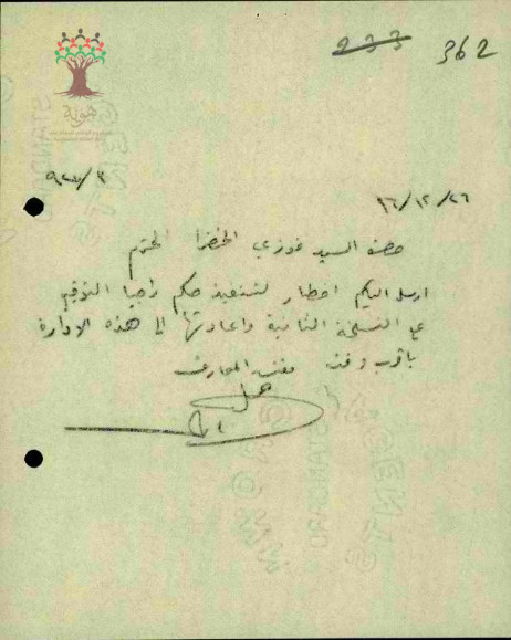 رسالة من مفتش المعارف الى المعلم فوزي الخضرا مرفقة باخطار لتنفيذ الحكم للتوقيع عليه
