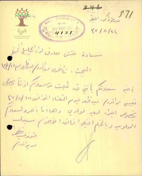 رسالة من المعلم فوزي الخضرا الى مفتش المعارف بخصوص تأخره عن المدرسة