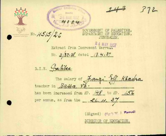 رسالة من مدير المعارف الى مفتش المعارف بخصوص زيادة راتب المعلم فوزي الخضرا السنوية