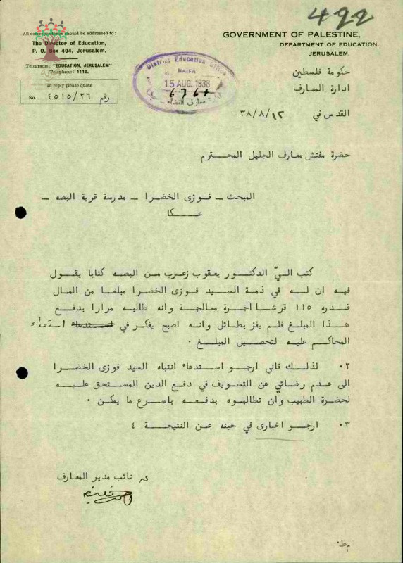 رسالة من نائب مدير المعارف الى مفتش المعارف بخصوص دين مترتب على المعلم فوزي الخضرا للطبيب يعقوب زعرب في قرية البصة