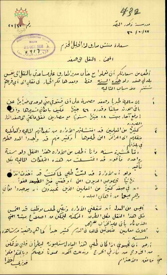 رسالة من المعلم فوزي الخضرا الى مفتش المعارف يطلب فيها نقله من مدرسة البصة الى صفد