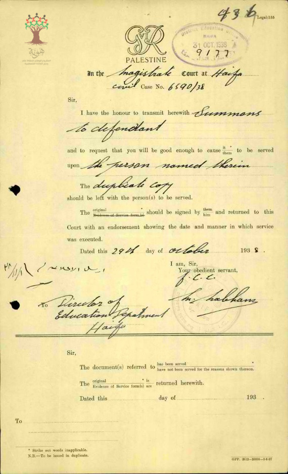 مجموعة رسائل بخصوص الدين المترتب على المعلم فوزي الخضرا مرفقة بالان مدعي عليه وأوراق تبليغ
